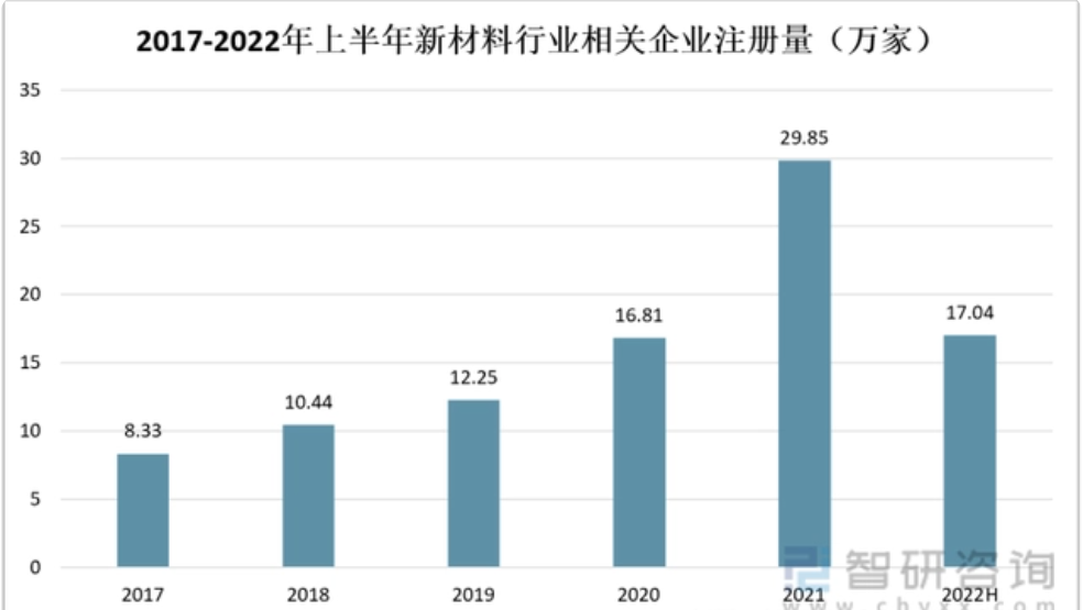 近几年,中国新材料相关企业注册量����� �������Ƴ������������ �������Ƴ������������ �������Ƴ����������� �������Ƴ�������总体呈现快速增长的趋势。201����� �������Ƴ������������ �������Ƴ������������ �������Ƴ������������ �������Ƴ�������7年-2021年我国新材料相关企业注册量由����� �������Ƴ������������ �������Ƴ������������ �������Ƴ������������ �������Ƴ�������8.33万家增至29.85万家,年����� �������Ƴ������������ �������Ƴ������������ �������Ƴ������������ �������Ƴ������均复合增长率37.6%。最新数据显示,截至20����� �������Ƴ������������ �������Ƴ����������� �������Ƴ������������ �������Ƴ�������22年上半年,我国新增新材料企业17.����� �������Ƴ����������� �������Ƴ����������� �������Ƴ������������ �������Ƴ�������04万家。