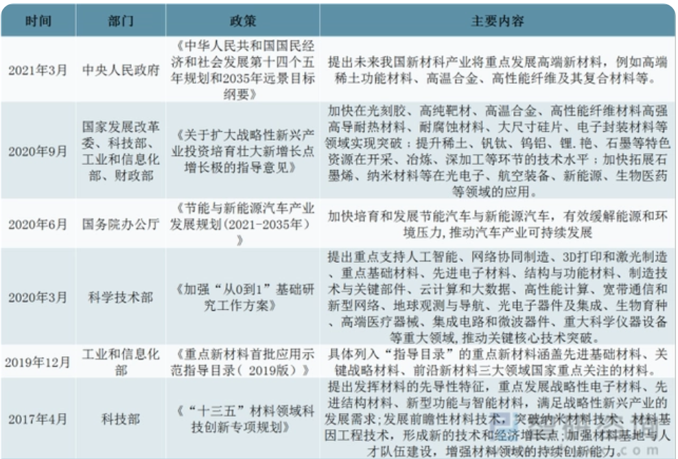 我国高度重视新材料产业发展����� �������Ƴ������������ �������Ƴ������������ �������Ƴ������������ �������Ƴ�������,目前通过纲领性文件、指����� �������Ƴ������������ �������Ƴ������������ �������Ƴ������������ �������Ƴ�������导性文件、规划发展目标与任务等构筑起新����� �������Ƴ������������ �������Ƴ����������� �������Ƴ������������ �������Ƴ�������材料发展政策金字塔,予以全产业链、全方位的����� �������Ƴ����������� �������Ƴ������������ �������Ƴ������������ �������Ƴ�������指导。近年来,国家相关部门制定����� �������Ƴ������������ �������Ƴ������������ �������Ƴ������������ �������Ƴ�������的鼓励新材料领域创新发展的相关政策。“中����� �������Ƴ������������ �������Ƴ������������ �������Ƴ������������ �������Ƴ�������国制造2025”“十四五战略性新����� �������Ƴ������������ �������Ƴ����������� �������Ƴ������������ �������Ƴ������兴产业发展规划”等相关政策、措施的出台,彰显了国����� �������Ƴ������������ �������Ƴ������������ �������Ƴ������������ �������Ƴ�������家大力发展新材料产业,解决关键����� �������Ƴ������������ �������Ƴ����������� �������Ƴ������������ �������Ƴ�������材料“卡脖子”问题的决心。����� �������Ƴ������������ �������Ƴ������������ �������Ƴ������������ �������Ƴ�������此外,“十四五”规划中明确指出要推动我国高����� �������Ƴ������������ �������Ƴ������������ �������Ƴ������������ �������Ƴ�������品质特殊钢材、高性能合金、高温合金等多个新型金����� �������Ƴ������������ �������Ƴ������������ �������Ƴ������������ �������Ƴ�������属功能材料下游应用领域取得突破����� �������Ƴ������������ �������Ƴ����������� �������Ƴ������������ �������Ƴ�������,在“十四五”规划指引下,新材料产业将进一步发展����� �������Ƴ������������ �������Ƴ������������ �������Ƴ������������ �������Ƴ�������,相关政策推动国内新材料产业迈入“高����� �������Ƴ������������ �������Ƴ����������� �������Ƴ������������ �������Ƴ�������精尖”的发展轨道。